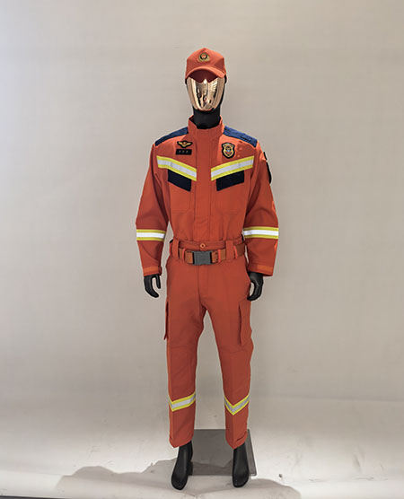 ●防護服面料分為外層、防水透氣層、隔熱層、舒適層。外層面料選用PMIA三合一芳綸布、收縮性小,易于洗滌并具有阻燃性(續燃時(shí)間0秒,毀損長(cháng)度為44mm,無(wú)熔融、滴落現象)、熱穩定性??節竦燃墳?級,色牢度為4極。